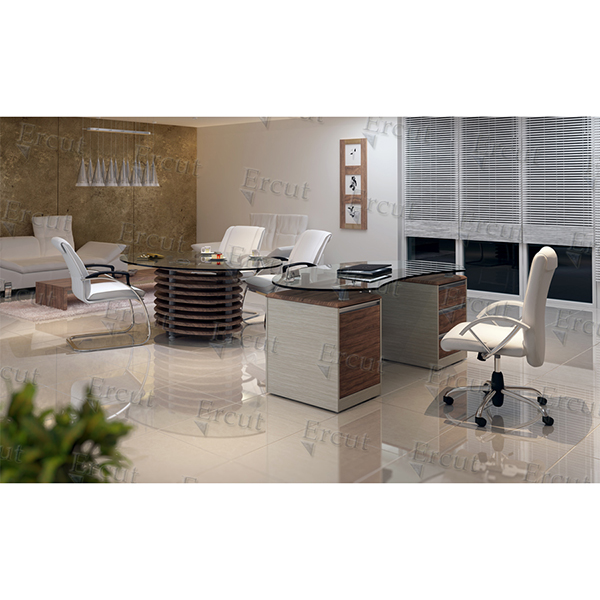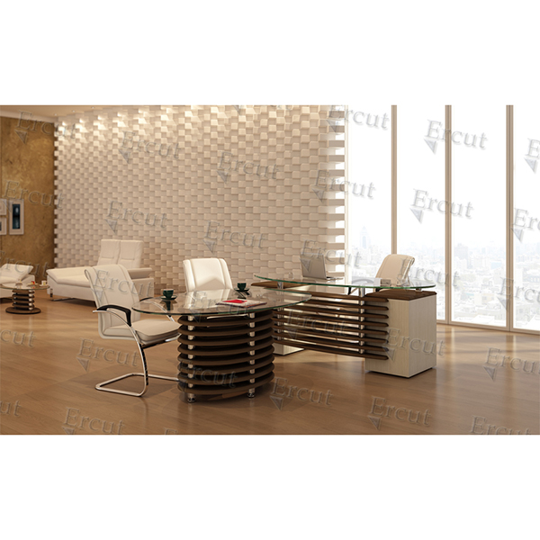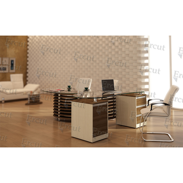 میز مدیریت صفحه ی میز شیشه ۱۵میل-طاق و پنل ۲۵میل- بدنه ها ۱۶میل – در دو طرح ال دار و دو صندوق-قابلیت تولید با روکش MDF,PVC ،ملامینه و چرم- دارای فایل ۳کشووکمد با درب آرام بند-ریل ساچمه ای- پایه های فلزی با رنگ الکترواستاتیک به همراه کفی از جنس ABS با قابلیت ریگلاژ تا ارتفاع ۳ سانتی متر- اتصالات پنل با لوله های پره ای آلومینیوم-