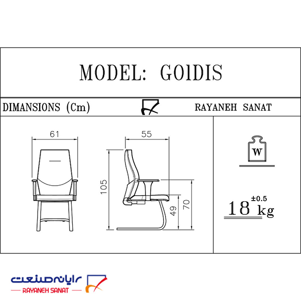 ویژگیها طراحی ارگونومیک مطابق اصول استاندارد نشیمن راحت با فوم سرد قالبی که تغییر شکل نمیدهد پایه فلزی با آبکاری کروم برای دوام و ظاهر شیک دستههای ثابت با روکش نرم برای راحتی دستها قابلیت انتخاب روکش از چرم یا پارچه ظاهر ساده و هماهنگ با دکوراسیون اداری