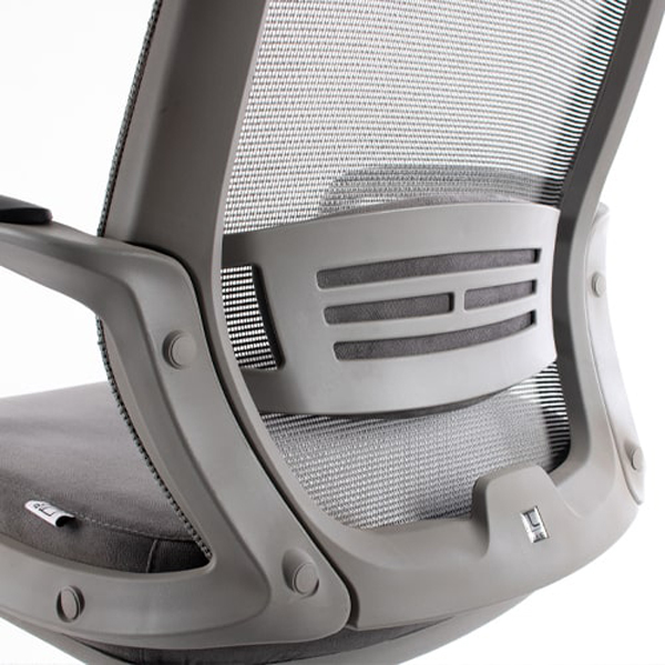 پشتی مش و قابلیت تنظیم کمرپشتی این صندلی از جنس مش با بافتی محکم ساخته شده است که علاوه بر زیبایی، امکان تهویه مناسب را فراهم میکند. پشت کمری قابل تنظیم نیز از قوس کمر محافظت کرده و راحتی بیشتری برای کاربر ایجاد میکند.